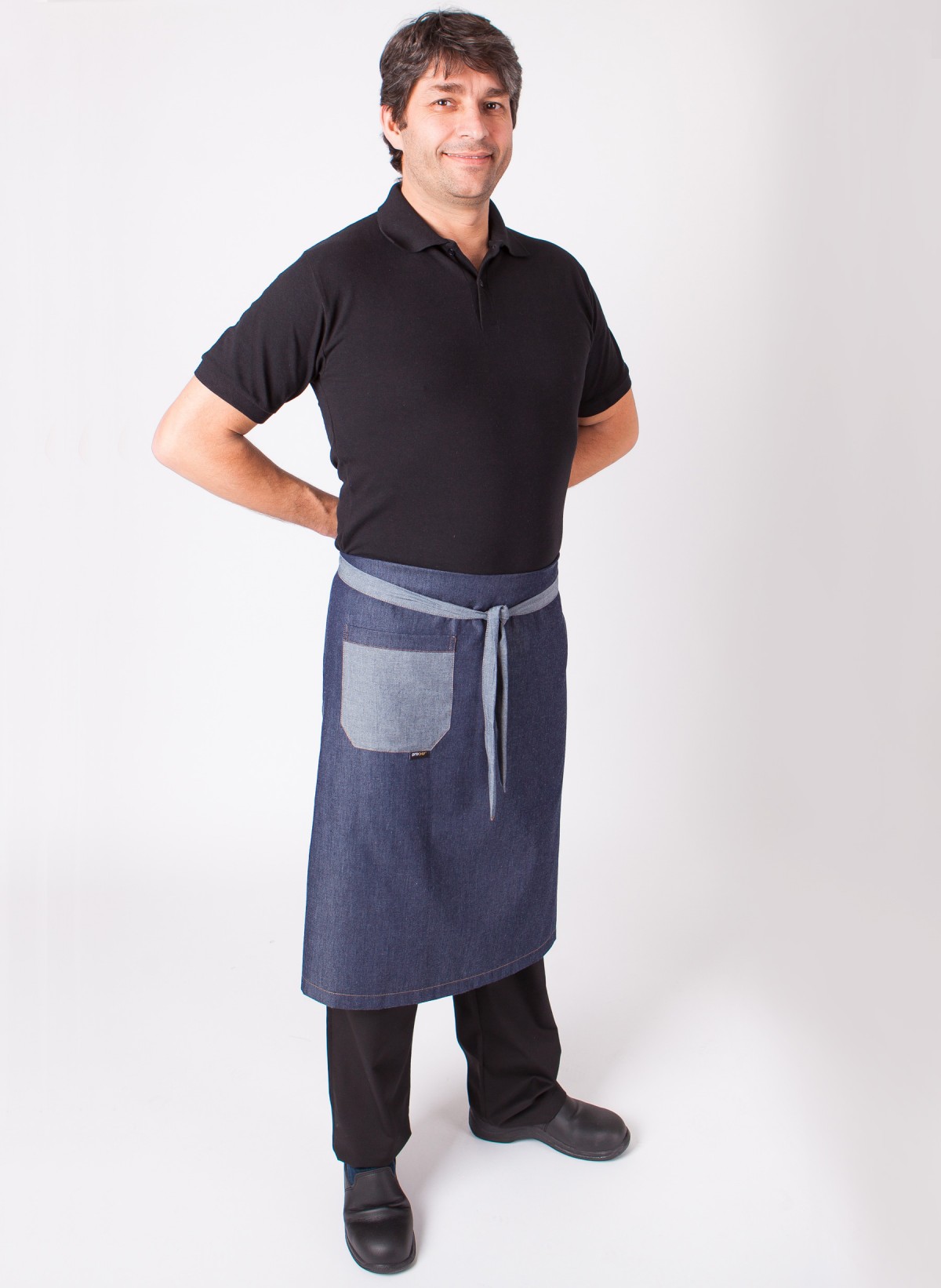 Avental de cintura em ganga com bolso na frente! Com um estilo casual e descontraído a ganga nunca passará de moda. Se trabalha em restauração o avental de cintura é resistente e prático, ideal para usar no dia a dia. Entre em contacto para saber mais sobre tecidos ou bordados personalizados.