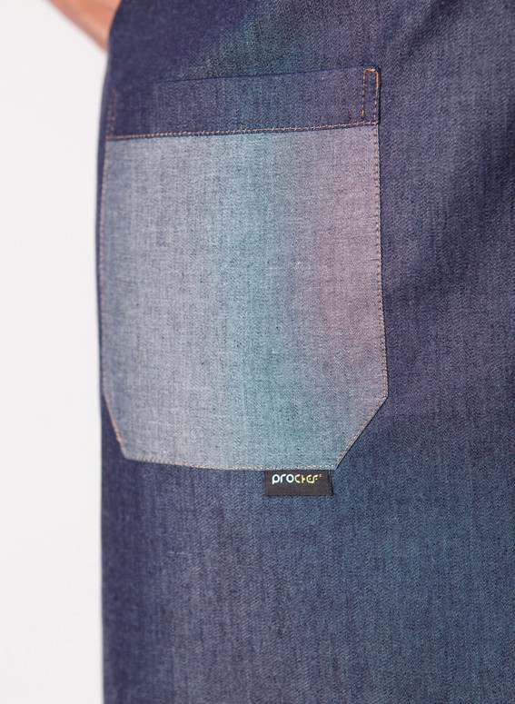 Avental Babete em ganga desenvolvido com dois bolsos.