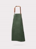 Avental ajustável desenvolvido em tecido 65% poliéster 35% algodão, de 240gr na cor verde caqui com dois bolsos na frente. Apresenta um alça ajustável em pele totalmente removível, que pode variar na sua tonalidade.