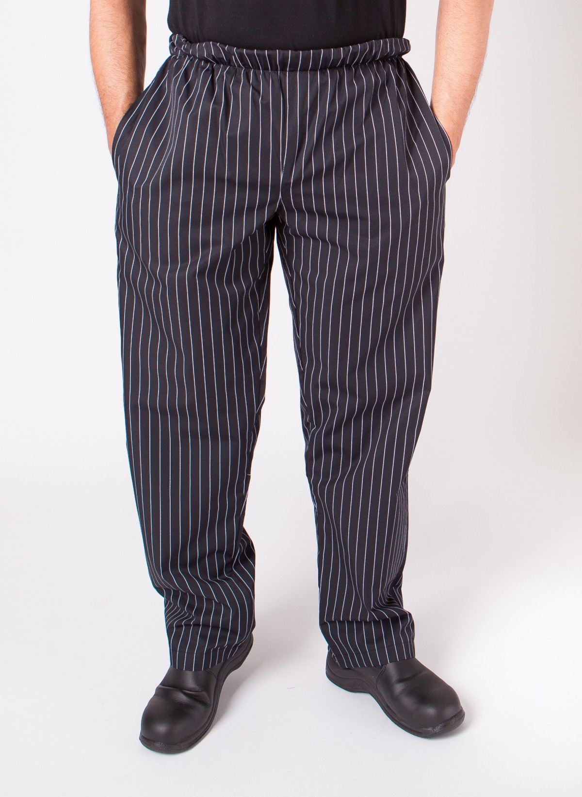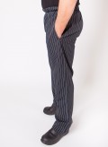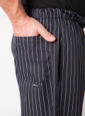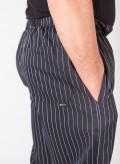 Calças de elástico às riscas com dois bolsos laterais e um atrás, desenvolvidas em tecido 65% Algodão 35% Polyester.