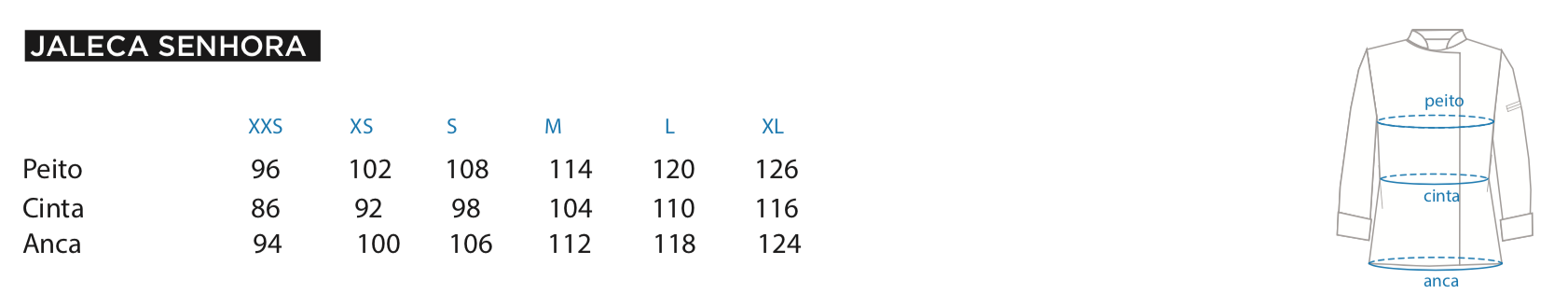 Para as jalecas de modelo feminino, devem ser consideradas as seguintes medidas (diferentes das outras jalecas de senhora disponíveis no site)