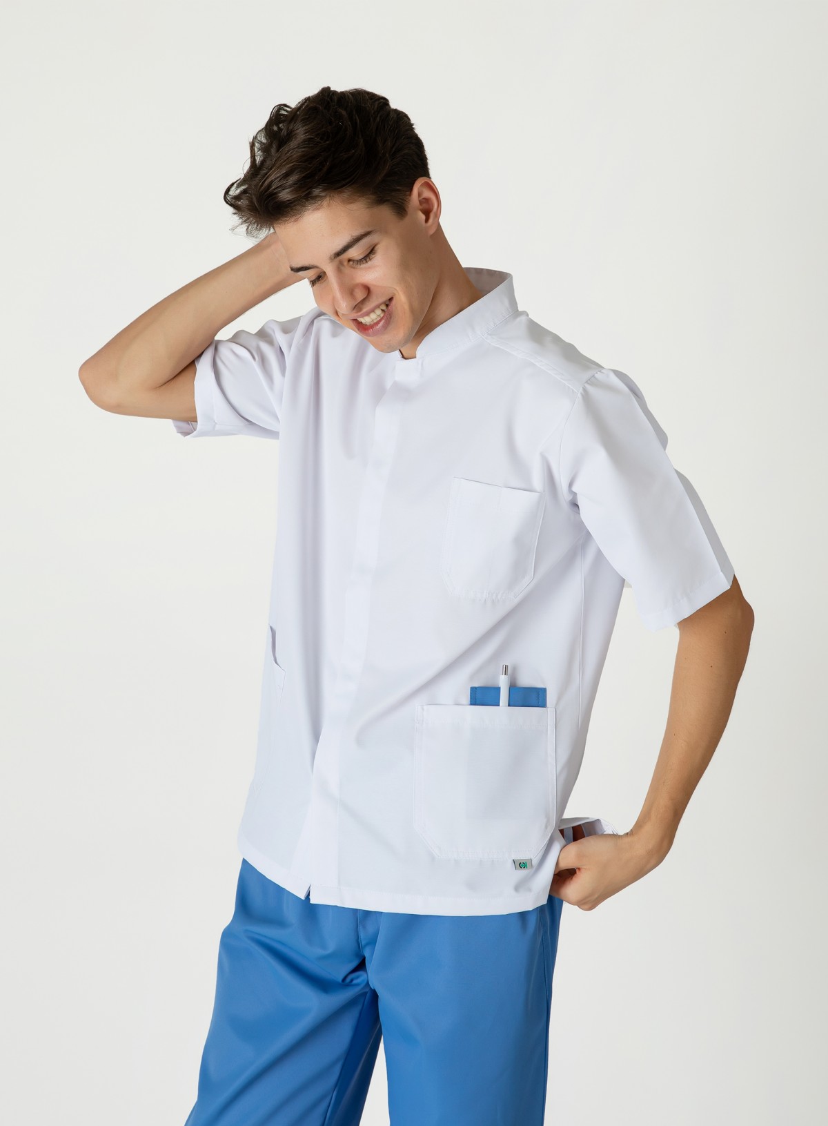 Túnica masculina desenvolvida em tecido MF antinódoas (67% Poliéster e 33% Algodão) com uma gramagem de 233 gramas.
